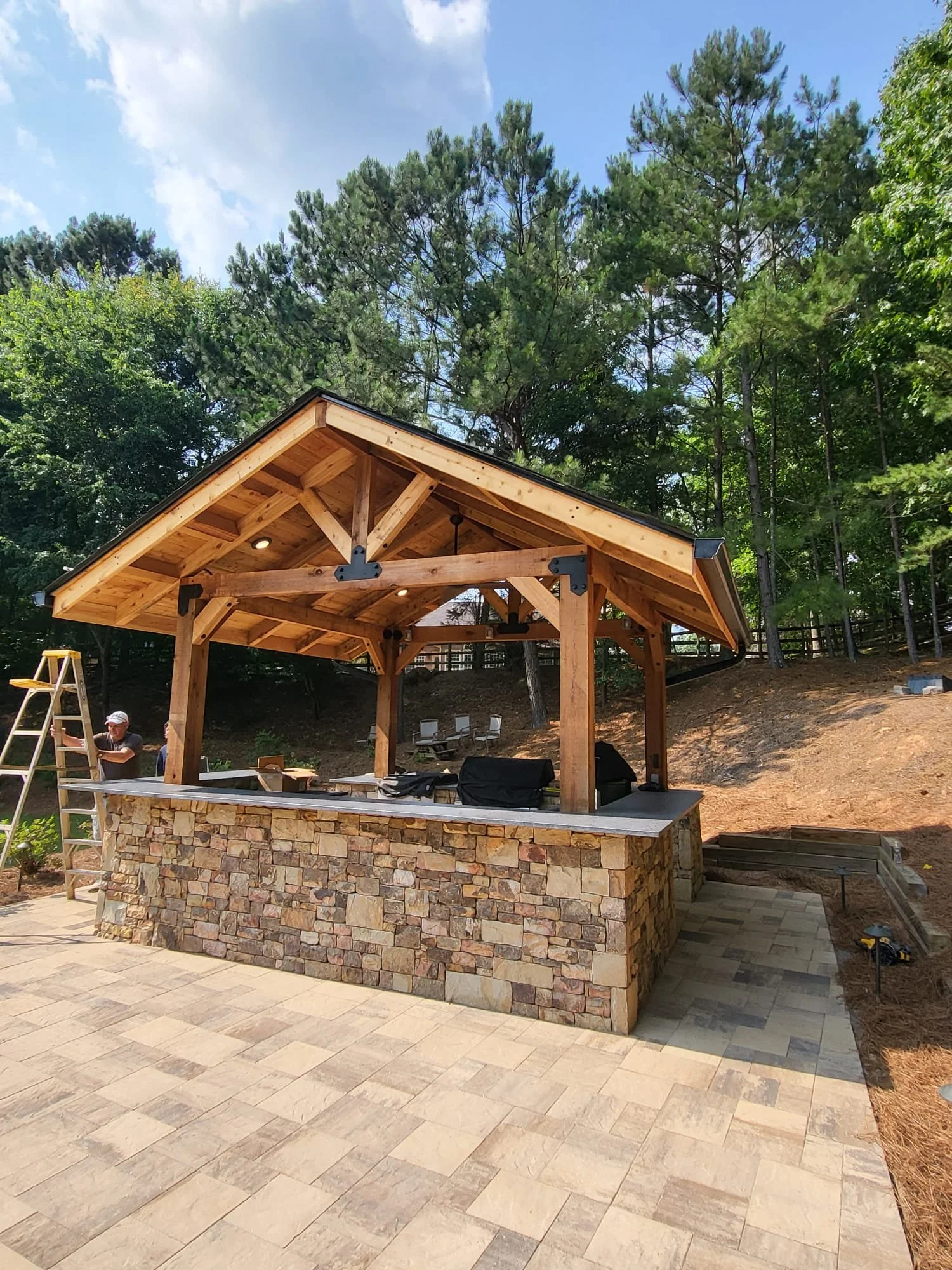 Poolside Projects Poolside Barbeque Poolside Shade Room Pergola style shade room Layered steps Black Screened Deck Double Decker Gazebo Area Waist Level Deck with rails Poolside Shade room with Chimney